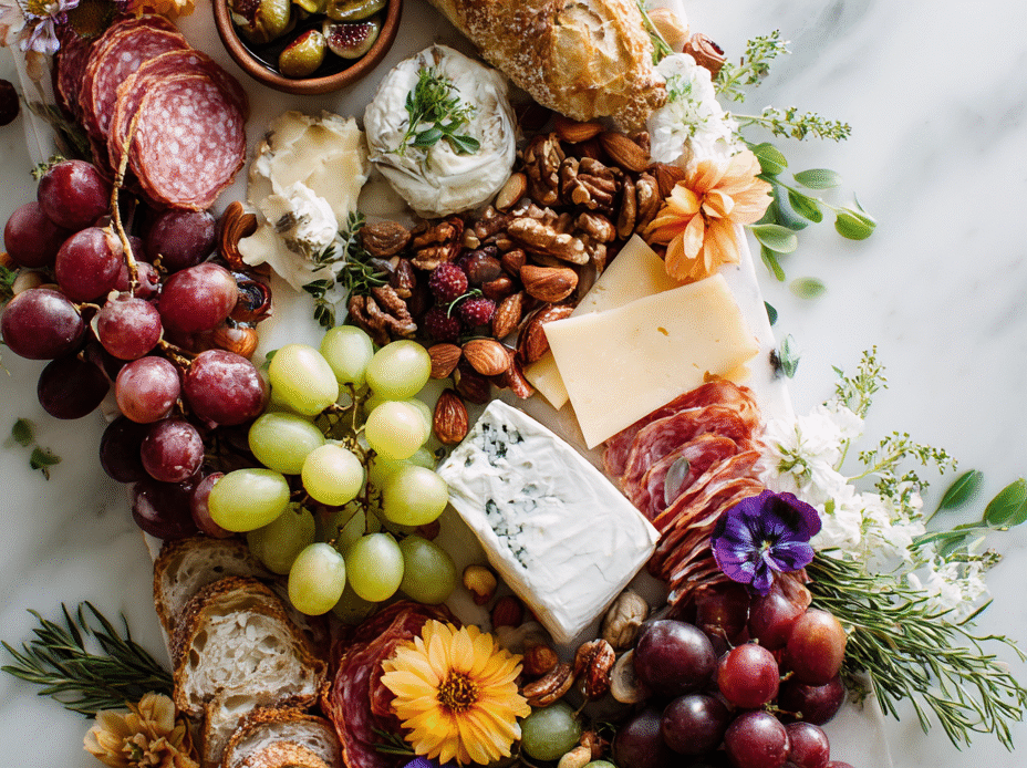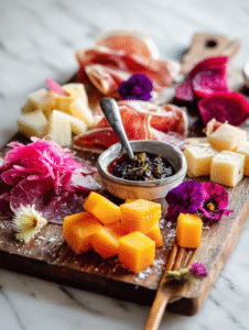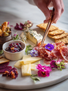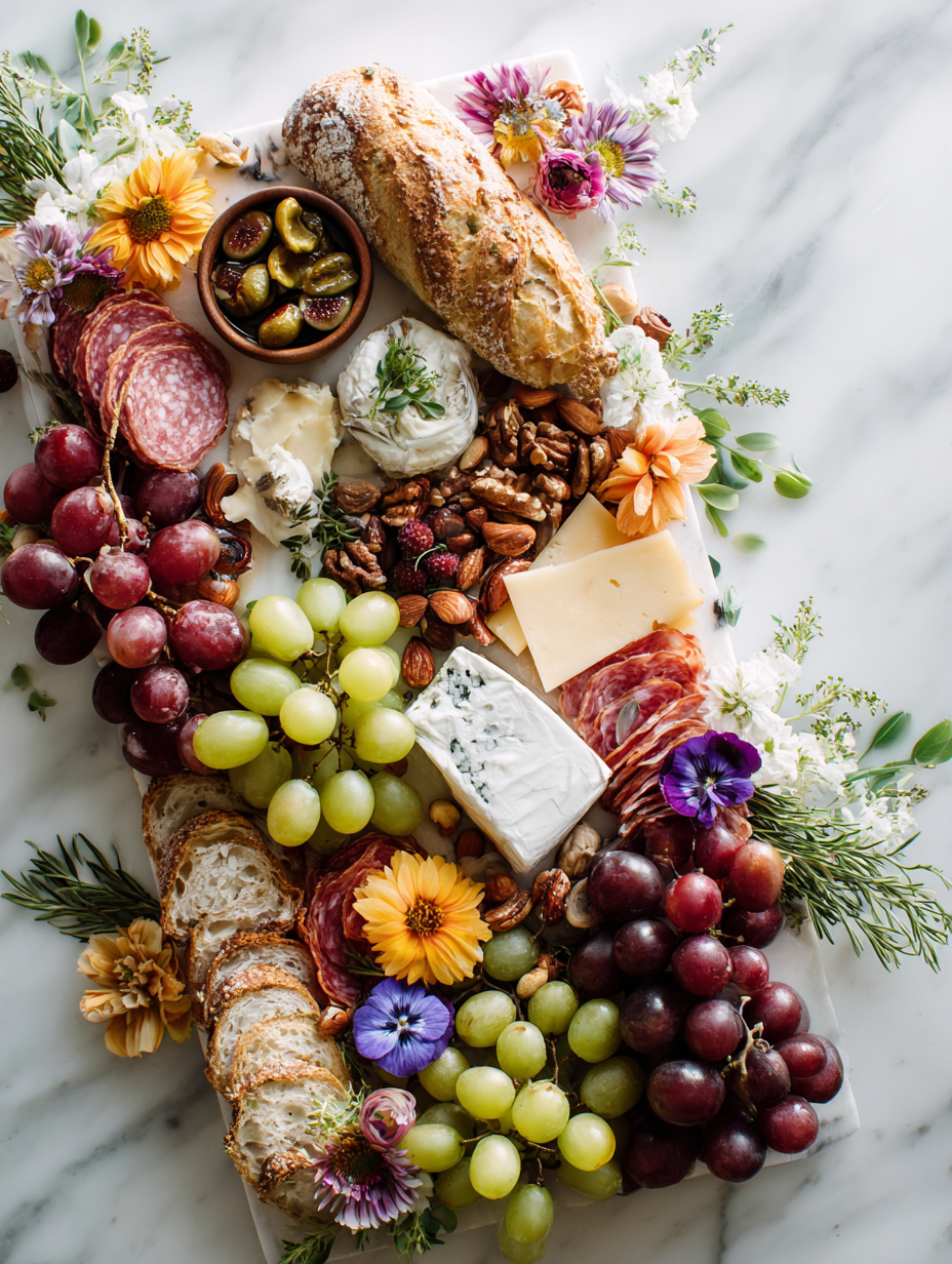 - Decorate the board with edible flowers, placing them delicately among the other ingredients to add a seasonal, floral touch.