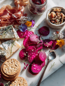 - Scatter slices of pickled beets across the board, adding vibrant color and a tangy crunch to the spread.