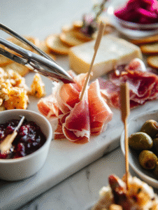 - Use tongs or toothpicks to help guests pick up and serve small items like prosciutto, beets, or cheeses easily and neatly.