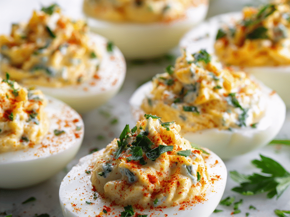 Christmas deviled eggs are a festive appetizer made by halving hard-boiled eggs and filling them with a creamy mixture of mashed yolks, mayonnaise, Dijon mustard, and lemon juice. Topped with smoked paprika and fresh herbs, they offer a smooth, flavorful bite with eye-catching presentation, perfect for holiday gatherings.