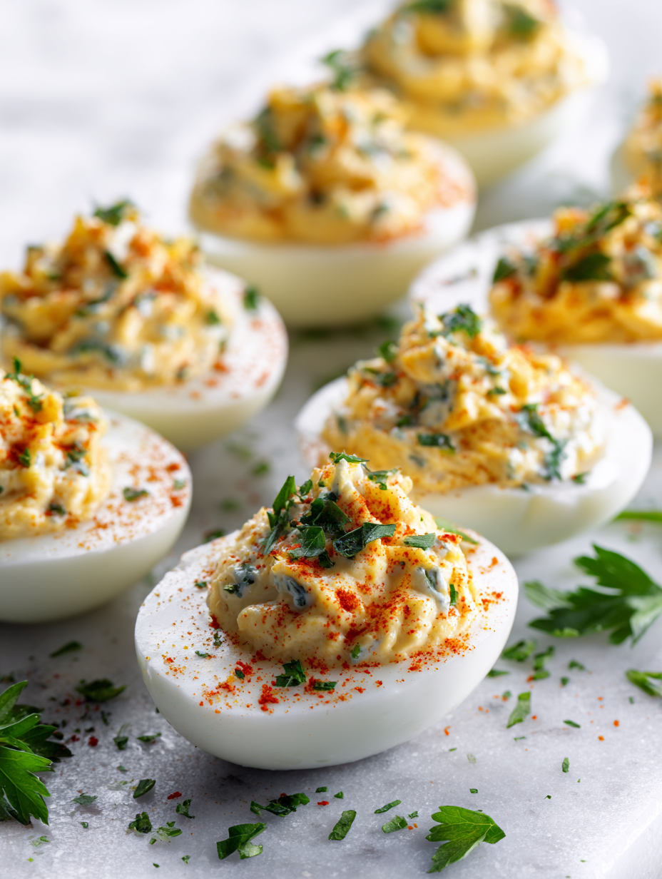 6. Garnish each deviled egg with a sprinkle of smoked paprika and a small sprig of fresh herbs for a festive touch. Optionally, top with crispy bacon bits for added texture and flavor.