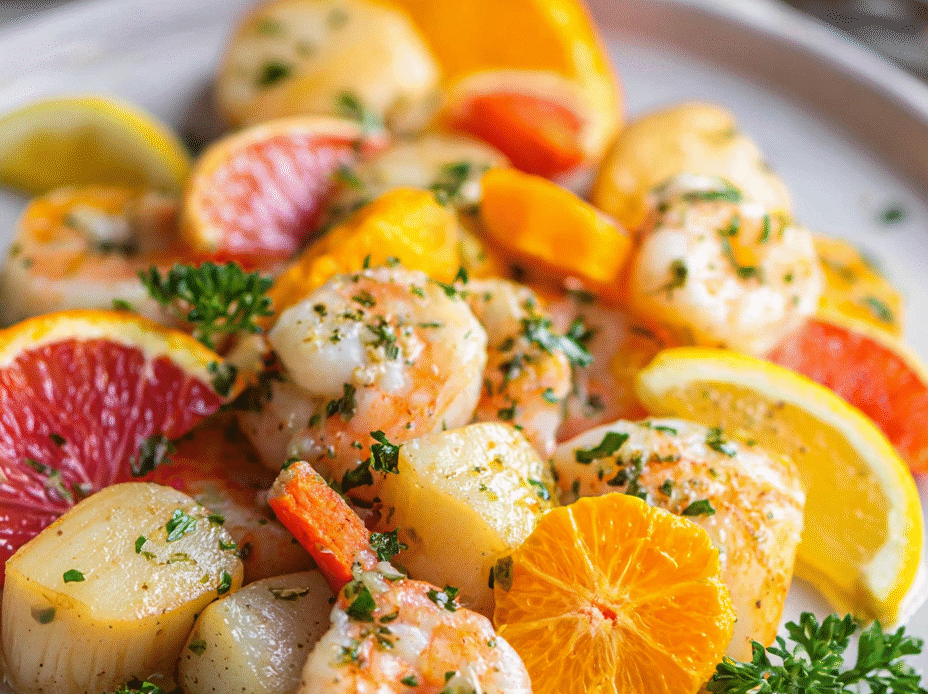 This vibrant seafood dish combines oysters, shrimp, and scallops sautéed in fragrant garlic, olive oil, and seafood stock, then finished with bright citrus zest and herbs. The final result is a colorful, juicy, and slightly smoky medley with a zesty, aromatic sauce that clings to each piece, perfect for a festive holiday table.