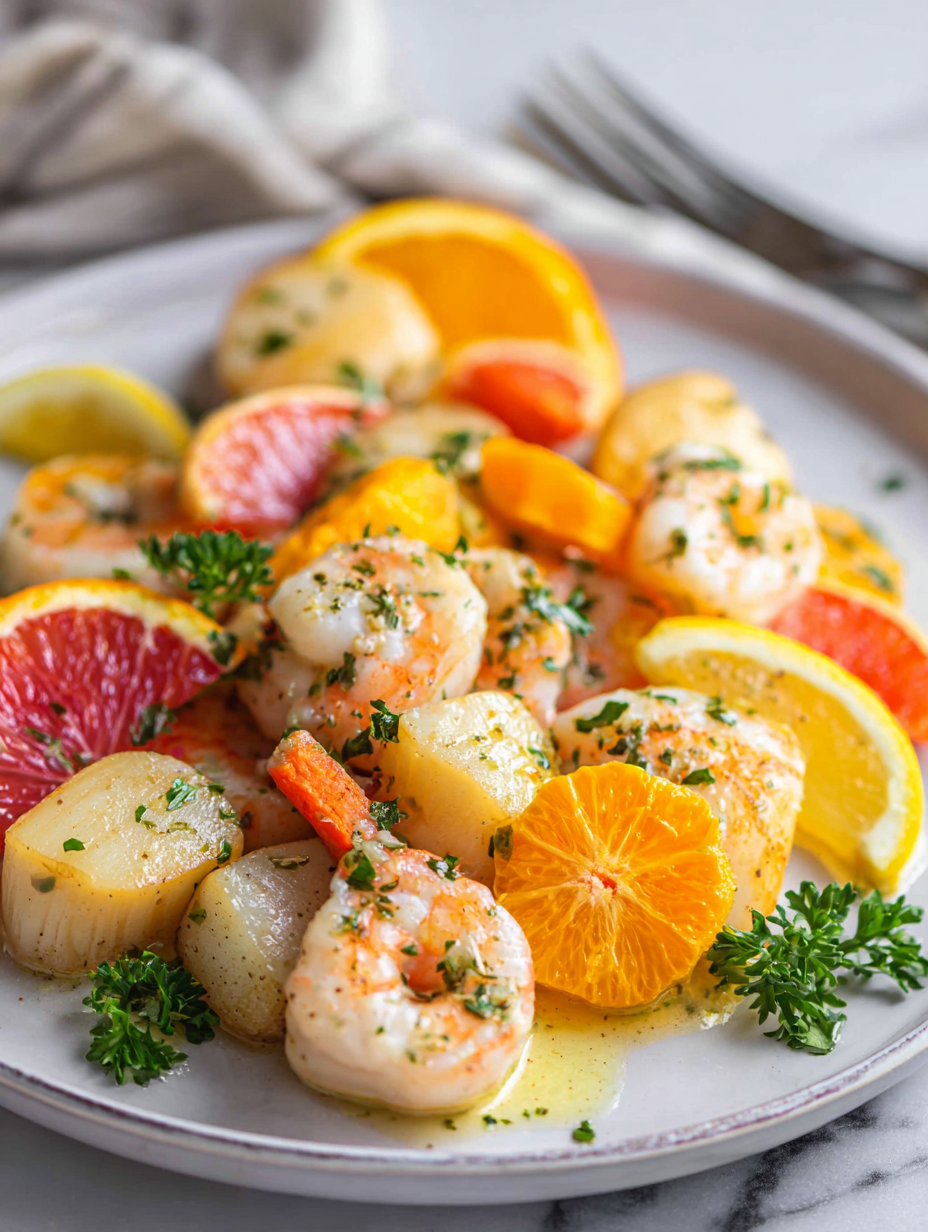 7. Remove the skillet from heat and let the seafood rest for a minute. Serve immediately, garnished with additional herbs and citrus zest, alongside crusty bread or a bed of greens for a complete festive presentation.
