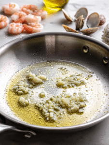 4. Add minced garlic to the hot oil, and cook until fragrant—about 30 seconds—then toss in the seafood. Sear each side for 2-3 minutes until they develop a golden crust and smell smoky.