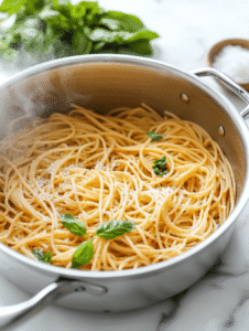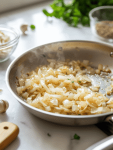 - Heat olive oil in a skillet over medium heat. Add chopped onion and minced garlic; sauté until translucent and fragrant, about 3-4 minutes. Watch for the onion to become tender and slightly golden.12 ounces spaghetti