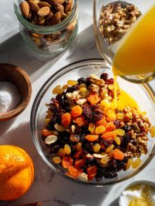 Step 2: Mix dried fruits, chopped nuts, and a splash of orange liqueur in a bowl. Let sit for 30 minutes to soak up the flavors.