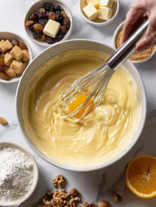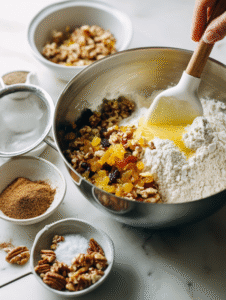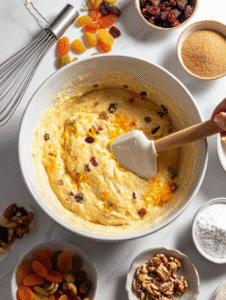 Step 5: Fold in the soaked fruits, flour, spices, and a pinch of salt. Mix until just combined.