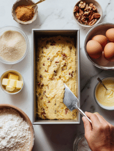 8. Pour the batter into your prepared loaf pan, smoothing the top with a spatula to create an even surface.