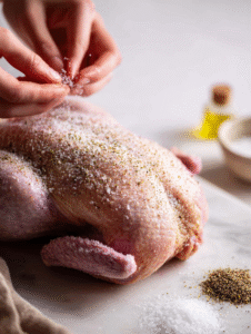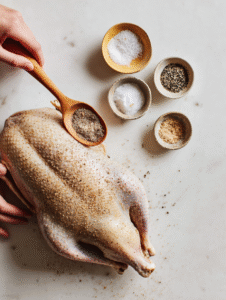 Step 3: Rub the duck with salt, pepper, and a pinch of five-spice powder.