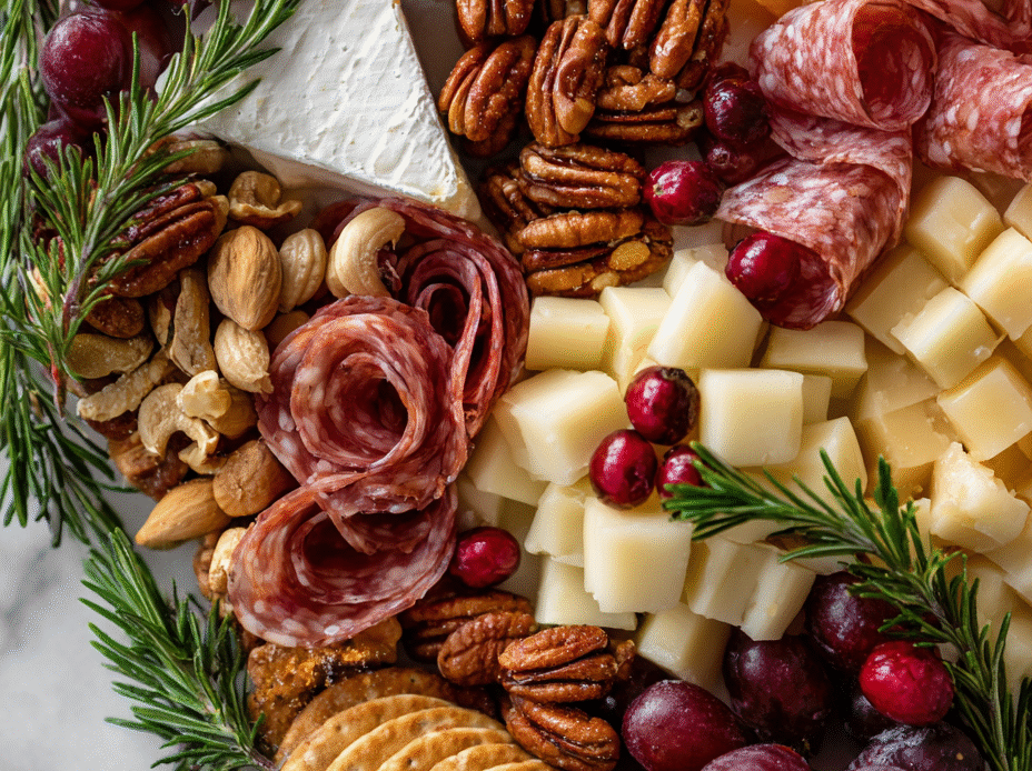 - Cured meats: Salami and prosciutto bring smoky, salty bites. For a leaner option, try turkey jerky or smoked chicken slices.