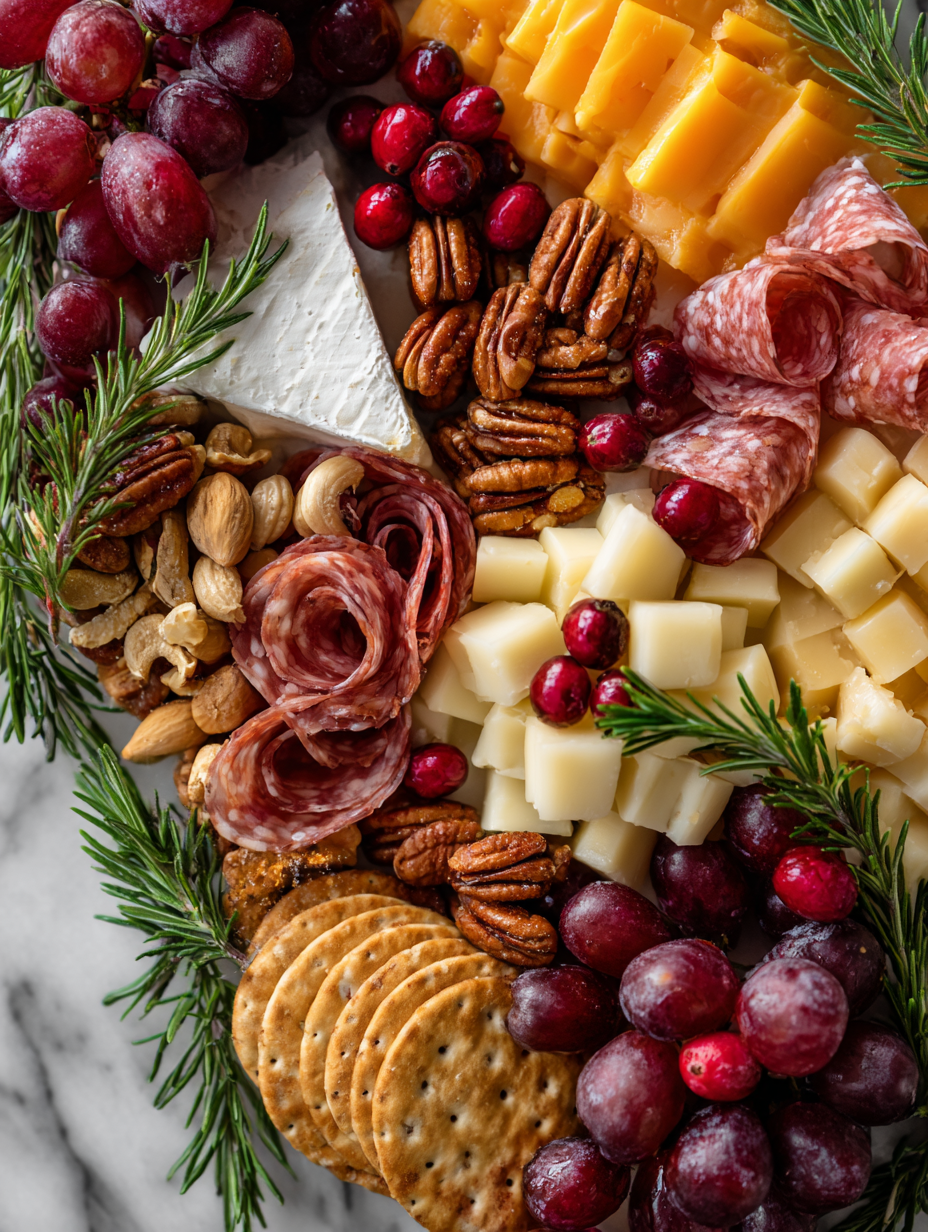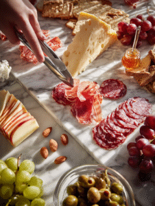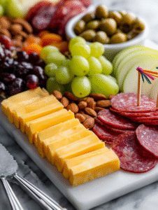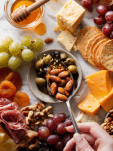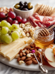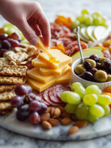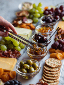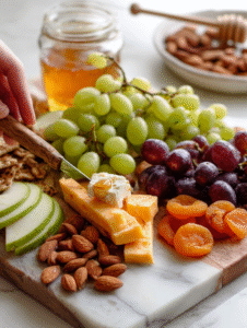 - Distribute fresh fruits: scatter grapes, apple slices, or dried figs. Brighten the board with some color and juiciness.