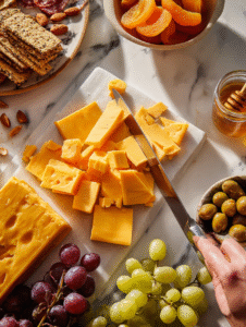 - Slice the cheese into chunks or slices and place them across the platter, mixing colors and textures for visual interest.