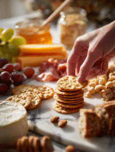 - Place crackers and bread: cluster them in accessible spots, leaving space for spreading or topping. Use a variety of shapes to add visual pop.