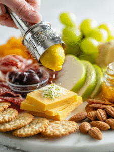 - Finish with final touches: decorate with decorative picks, zest some lemon over cheese for brightness, and step back to see balance.