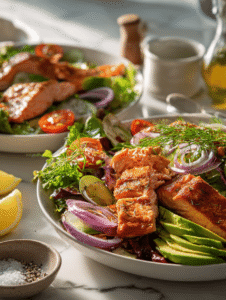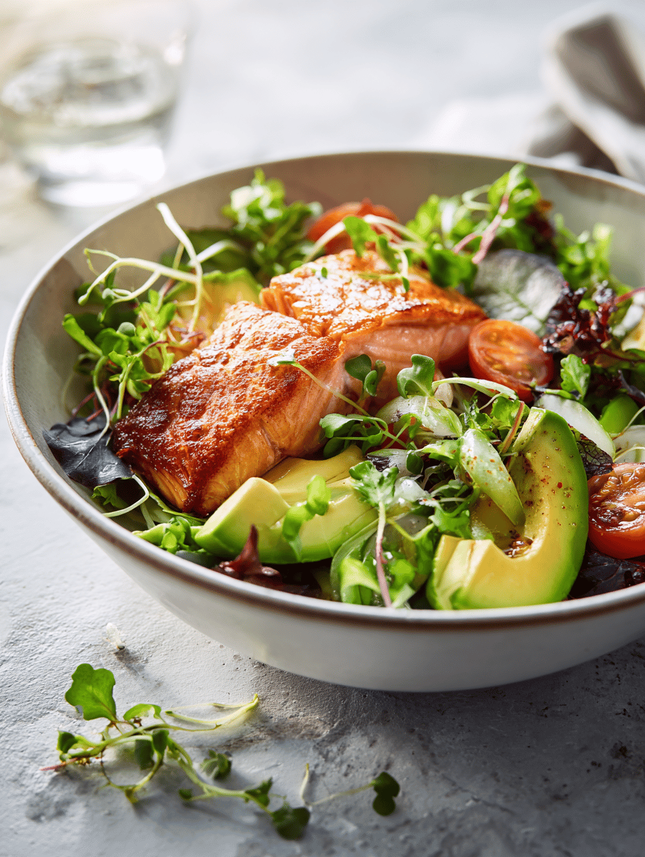This salad is more than just a pretty plate. It’s a mix of textures—crispy salmon, creamy avocado, crisp greens—that makes each bite interesting. The lemony dressing lifts everything with a fresh zing. Feel free to add your own twist—maybe some capers or a dash of hot sauce. It’s a dish that invites personalization and makes you feel like you’ve got a secret to share.