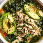 This keto chicken soup is a comforting, nourishing dish made with tender chicken, zucchini, and spinach simmered in a flavorful chicken broth. Finished with a touch of heavy cream, it has a silky texture and vibrant green and white appearance. The recipe emphasizes quick preparation and customizable ingredients, making it perfect for busy days.