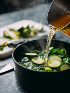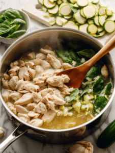 5. Pour in the chicken broth and bring it to a gentle simmer. As it warms, add sliced zucchini and chopped spinach directly into the broth, allowing the vegetables to start softening.