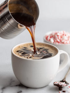 - Pour the hot, peppermint-infused milk over the prepared coffee in your mug, creating a creamy, inviting layer.
