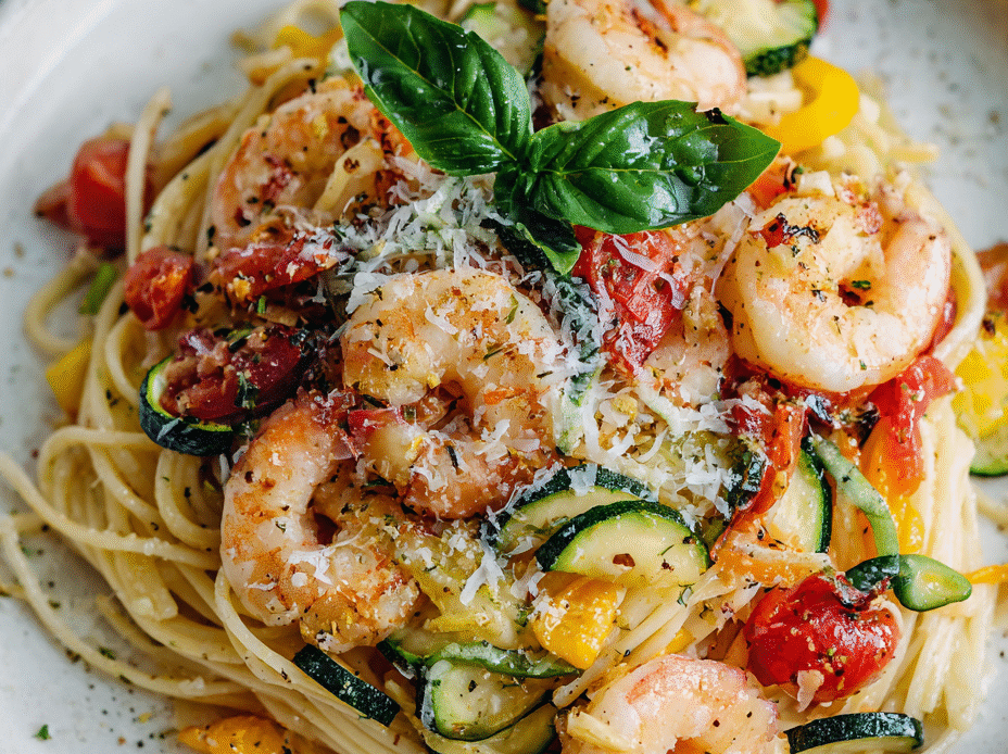 Focusing on the art of balancing seasonal vegetables with perfectly cooked shrimp to create a vibrant, fresh pasta primavera that feels both rustic and refined.