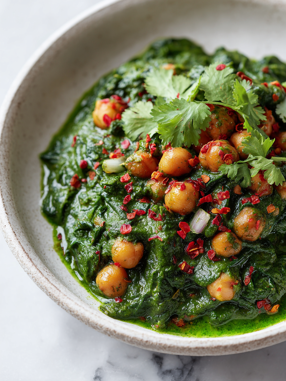 This hearty spinach and chickpea curry combines earthy, tender chickpeas with vibrant, wilted spinach in a rich, smoky coconut sauce. The dish is cooked with toasted spices and fresh aromatics, resulting in a velvety texture and a warm, inviting appearance. Perfect for quick, comforting meals that feel both nourishing and flavorful.