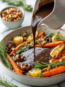 - Pour the warm mushroom gravy generously over the roasted vegetables and sprinkle with toasted nuts if using for added crunch.