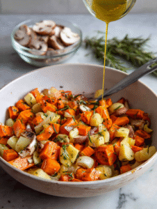 - Toss the chopped vegetables with olive oil, chopped rosemary, thyme, minced garlic, salt, and pepper until everything is well coated.