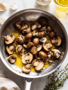 Step 4: Make the mushroom gravy: sauté chopped mushrooms, garlic, and thyme until deeply browned.